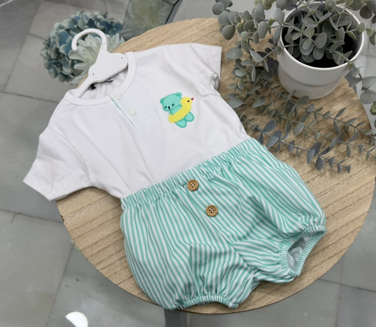 Conjunto algodon modelo osito verde rayas niño