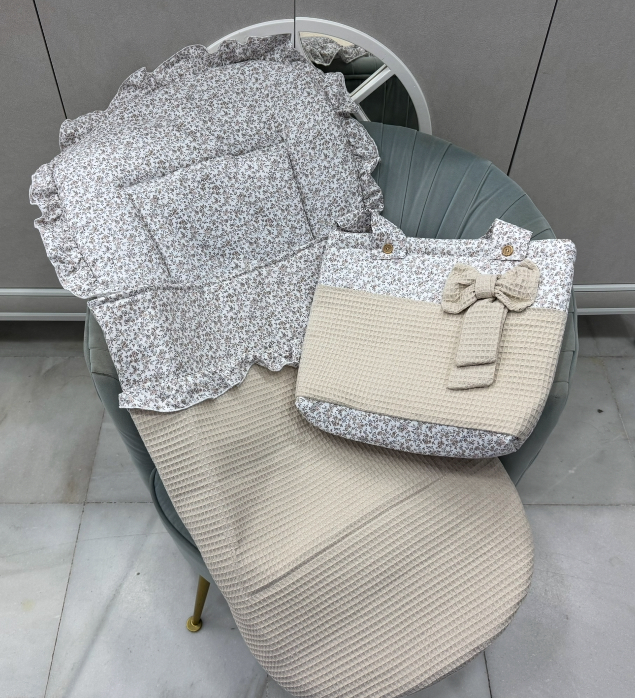 conjunto saco más talega modelo flor wafle camel cantidad