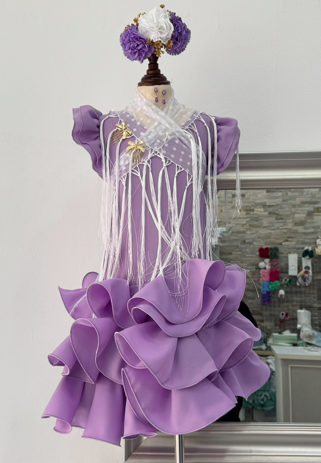 Contiene vestido, mantón, tres flores, ramillete dorado, dos peinecillos y pendientes