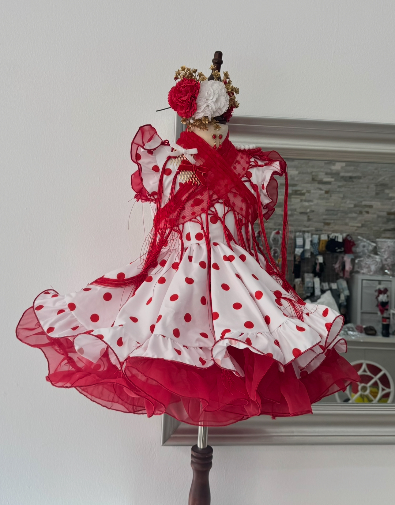 El pack contiene vestido, manton, pendientes, dos peinecillos, tres claveles, ramillete dorado y dos pulseras