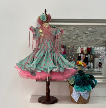 El pack contiene vestido, manton, pendientes, dos peinecillos, tres claveles, ramillete dorado y dos pulseras